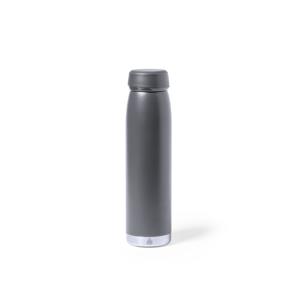 380ml capacity thermal bottle, made in recycled, double wall stainless steel, with matching screw cap and silver base. Available in a wide range of satin colours, BPA free and presented in an individual box in kraft design. Steel is one of the most demanded materials and can be found almost everywhere, from everyday products to major constructions. With countless properties, including durability and a high level of reusability, it is a much valued alternative for sustainable solutions. Properly treated, new resources of infinite use can be obtained.