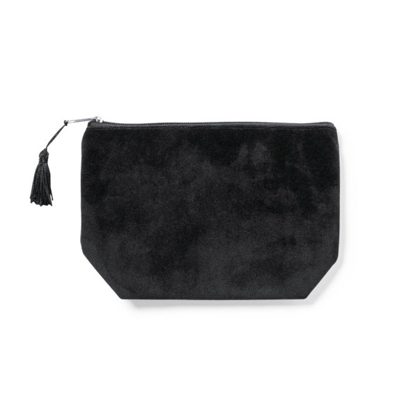 Beauty bag with soft velvet touch. With zip closure and tassel puller. Made in rayon velvet with stitching finish and available in brown and black colours.