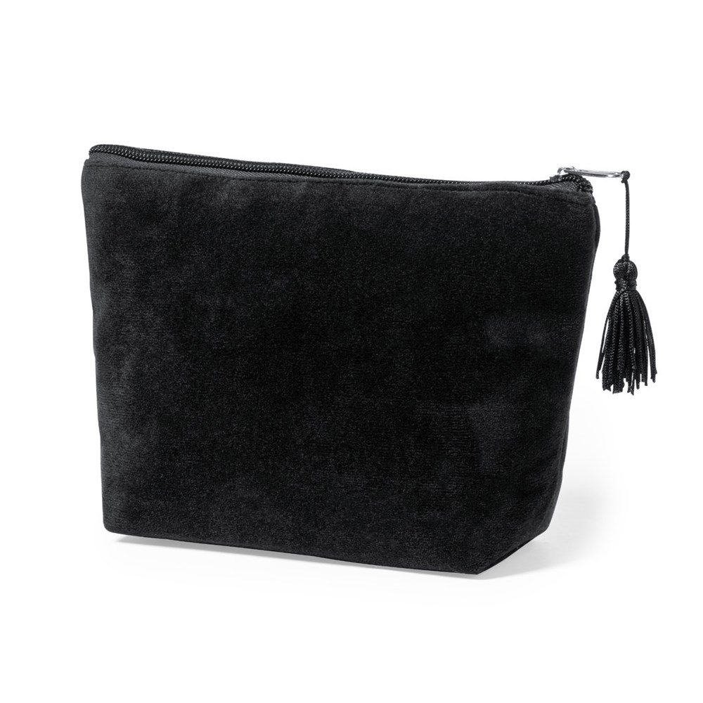 Beauty bag with soft velvet touch. With zip closure and tassel puller. Made in rayon velvet with stitching finish and available in brown and black colours.