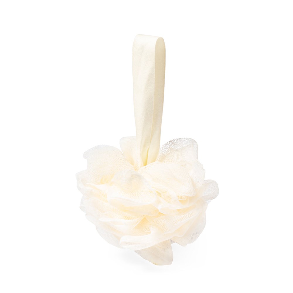 Soft bath sponge made of PE fibre, with matching fastening strap and a large printing surface.