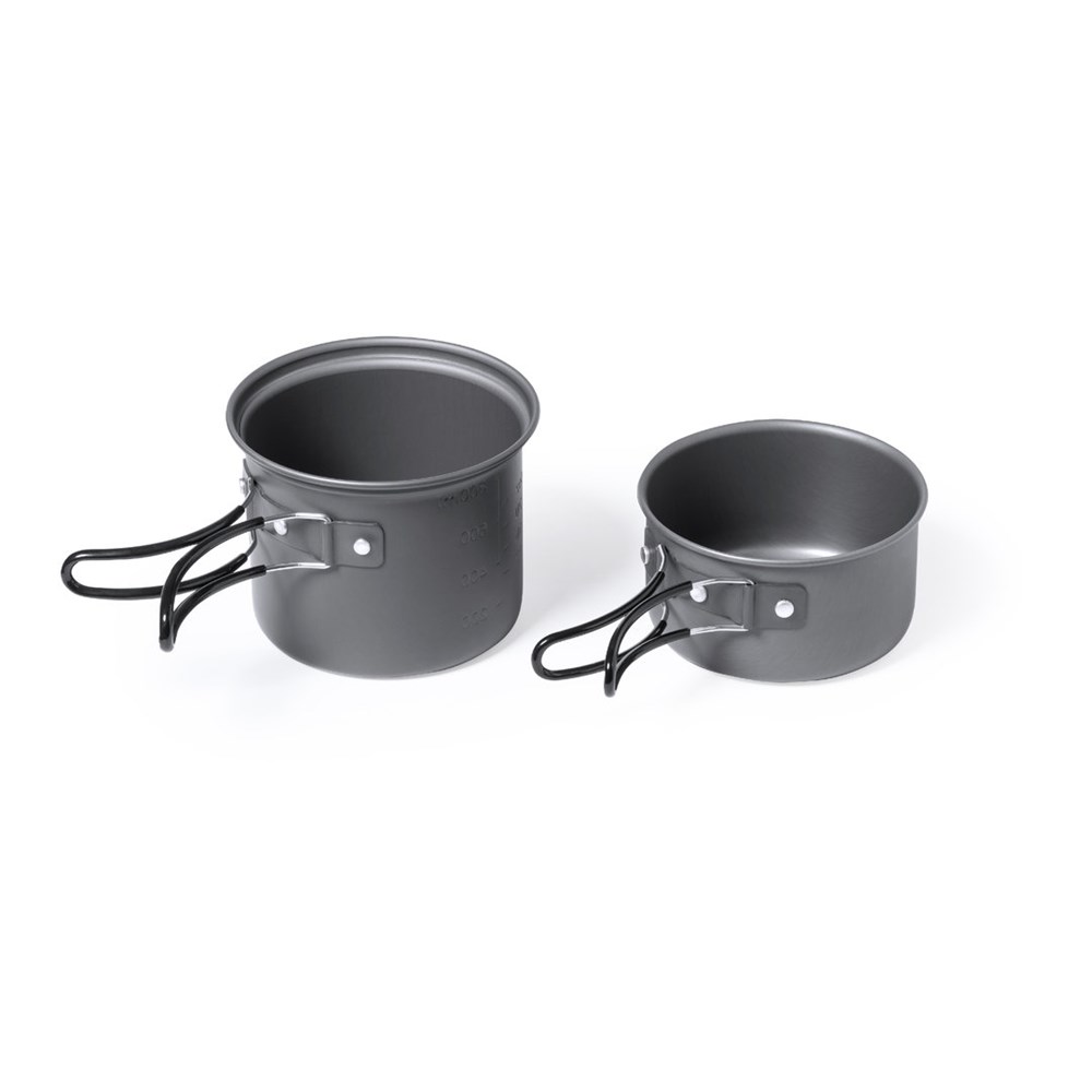 Complete set of camping utensils in an ultra-compact size. Presented in a resistant RPET pouch with drawstring closure, adjusting accessory and outside label with the RPET distinctive. Contents:1 aluminium pot in matte finish grey aluminium. 800 ml capacity 13 cm diameter x 10 cm height. Folding handles with burn protection.1 aluminium saucepan with matte finish. 600 ml capacity 12 cm diameter x 6.5 cm height. Folding handles with burn protection.Folding spoon, knife and fork, made in stainless steel. With die-cut handle and safety locks. Presented in an individual RPET pouch with drawstring closure. RPET material is made from recycled plastic, to encourage the reuse of plastic waste and help the sustainability of the planet.