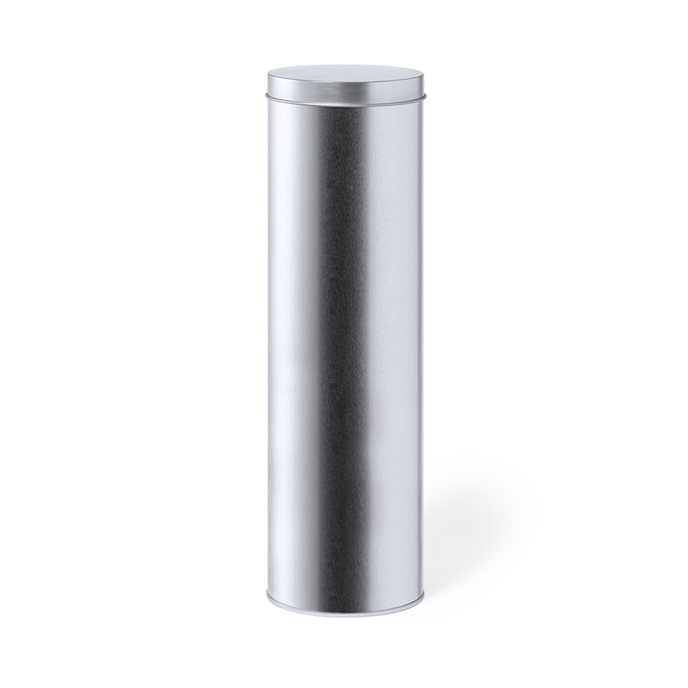Presentation box in cylindrical format, made in resistant metal with silver finish and matching lid.
