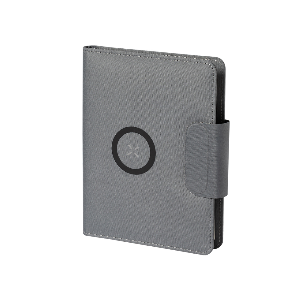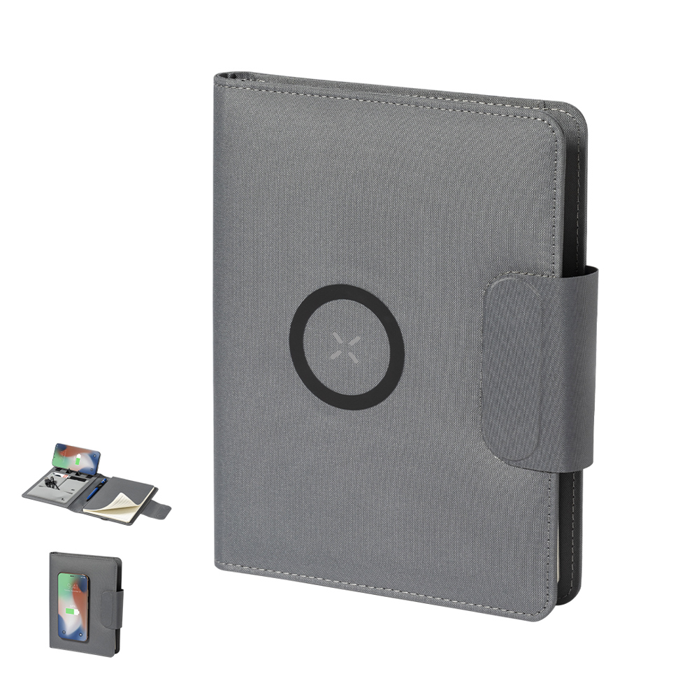 Multifunctional folder/notepad in 300D RPET polyester, made from recycled plastic, promoting the reuse of plastic waste and helping the sustainability of the planet. With magnetic closure and RPET label inside. 10W wireless charger integrated in the cover, with magnetic fastening to use the device while charging and including adhesive ring, compatible with all devices with Magsafe and Qi technology. Integrated battery with 5,000 mAh charging capacity, with Type C input/output port and LED charging status indicator, cable included. Inside with smartphone holder and a variety of card compartments, including pen holder and A5 notepad with 65 sheets of single-stripe layout. Presented in an attractive design box. The capacities shown in all our external auxiliary batteries are real, all of them incorporating non-recycled, grade A batteries, with a service life of at least 500 charging cycles, and complying with CE regulations. In addition, they are manufactured according RoHS standards, and in compliance with the following safety requirements: Power bank overcharge protection system. Complete discharge protection system, which increases the durability of the power bank. Blocking system to prevent short circuits. Constant charging transfer system, in accordance with the capacity of the target device.