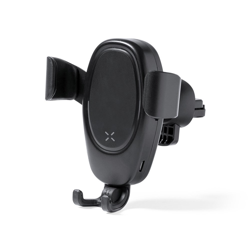 Car grill holder for smartphone with integrated 10W wireless charger. Universal, automatic adjustment mechanism to enable use of the device while charging. Compatible with devices equipped with wireless charging technology. Presented in an attractive, individual design box.