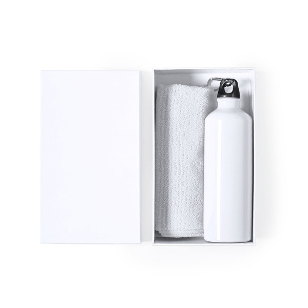 Matching bottle and towel set. Including: 800 ml capacity bottle with gloss finish aluminum body. With screw-on safety lid and metal carabiner for portability. Absorbent towel made in microfiber of 160g/m2 and in size 40x90 cm. Set available in a wide range of colors and presented in matching cardboard box.