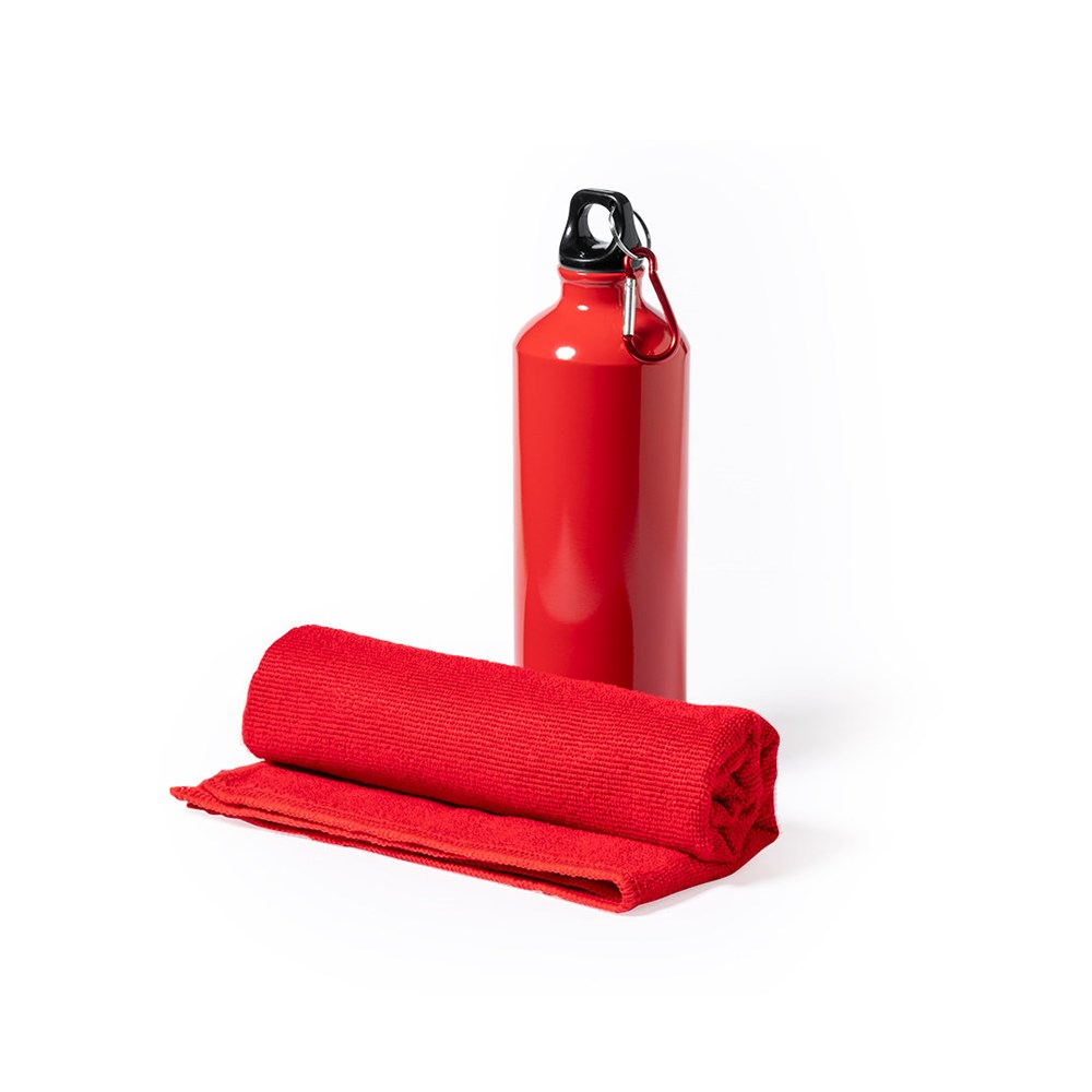 Matching bottle and towel set. Including: 800 ml capacity bottle with gloss finish aluminum body. With screw-on safety lid and metal carabiner for portability. Absorbent towel made in microfiber of 160g/m2 and in size 40x90 cm. Set available in a wide range of colors and presented in matching cardboard box.