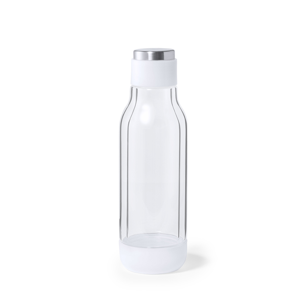 Double-walled thermal bottle, in an original, high quality design and with a capacity of 500 ml. Made of borosilicate glass, which offers exceptional resistance, aesthetics and durability, thus reducing the consumption of disposable products. Innovative transparent case allowing to see the inside, in combination with white color, and manufactured with insulating materials. Presented in an attractive design box.