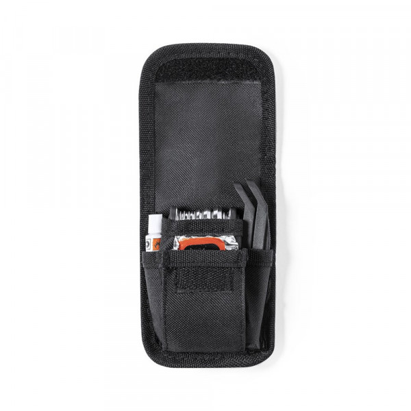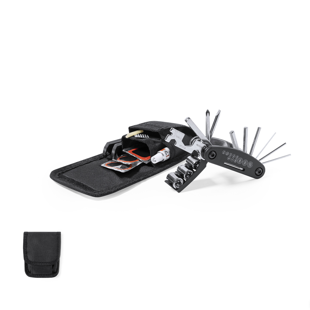 Full bike repair kit with 14 accessories. Packed in a durable 600D polyester case with velcro closure. Including tyre changer, multi-tool and puncture repair kit.