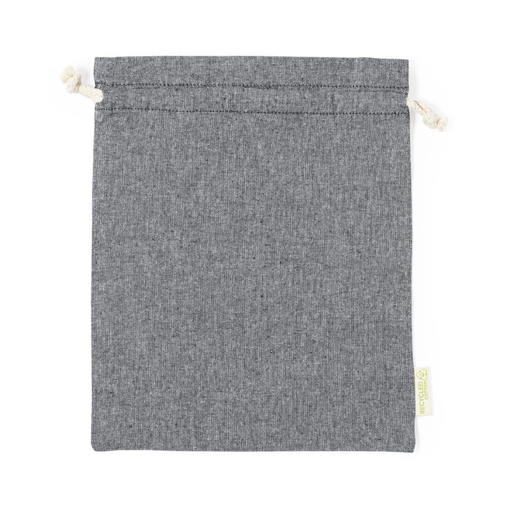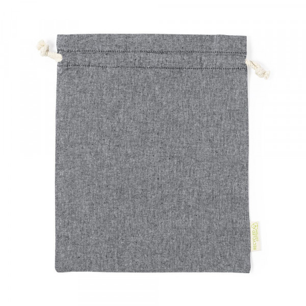 Eco-friendly bag in resistant recycled cotton material of 120g/m2. GRS (Global Recycled Standard) certification, guaranteing the recycled origin of the material used to manufacture the product. Cotton drawstring closure and stitched finish, including outside label with recycled cotton logo.