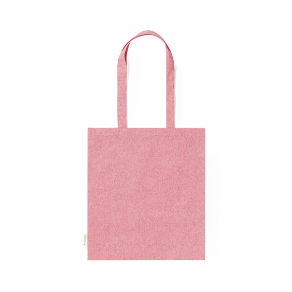 Bag made of recycled cotton material 140g/m2. GRS (Global Recycled Standard) certification, which guarantees the recycled origin of the material used to manufacture the product. Stitched finish, with 70 cm in lenght, reinforced handles, and available in a wide range of colours. Resistance up to 8kg, including recycled cotton emblem on label.