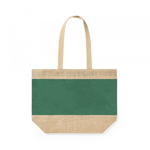 Bag in durable combination of laminated jute and laminated cotton, with natural cotton handles. Stitched finish with long, reinforced handles, and available in a wide range of colours. Resistance up to 10kg weight.