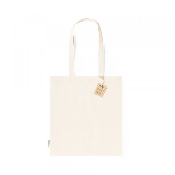 Bag made of organic cotton material 140g/m2, in natural tone finish. Stitched finish, with medium size, reinforced handles 70 cm in length. Resistance up to 8kg, including organic cotton emblem on label and hangtag in recycled cardboard.
