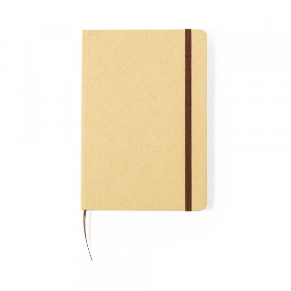 A5 nature line notebook with hard covers in durable recycled cardboard. 100 plain sheets in kraft finish with recycled label, elastic band and matching fabric bookmark.