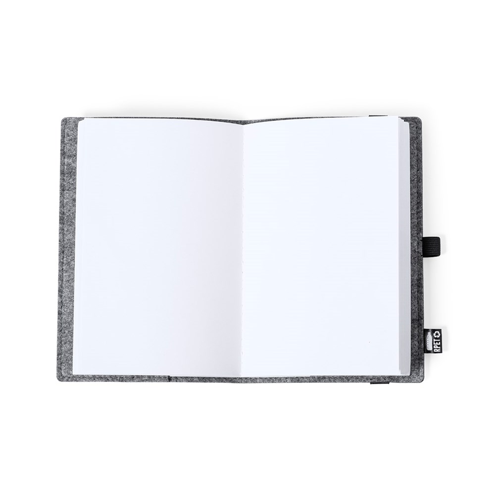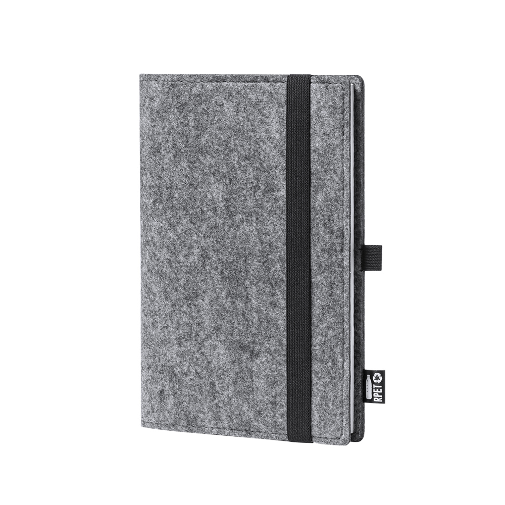 A5 nature line notepad with RPET recycled felt cover. The result of the combination of the recycling processes of plastic materials along with the millenary technique of felt manufacturing, resulting in an eco-trend material that, in addition to being of recycled origin, also becomes recyclable. Including 100 plain sheets. With elastic band, pen holder and RPET label on cover.