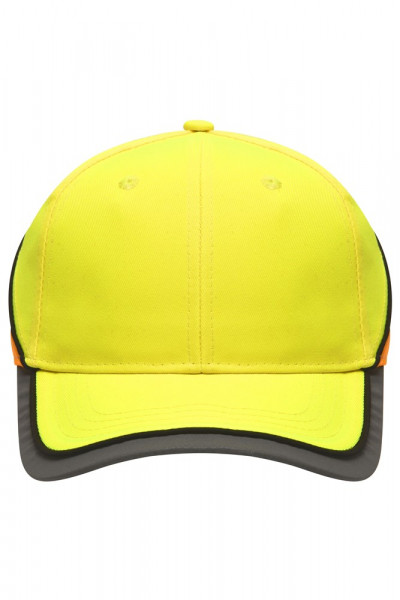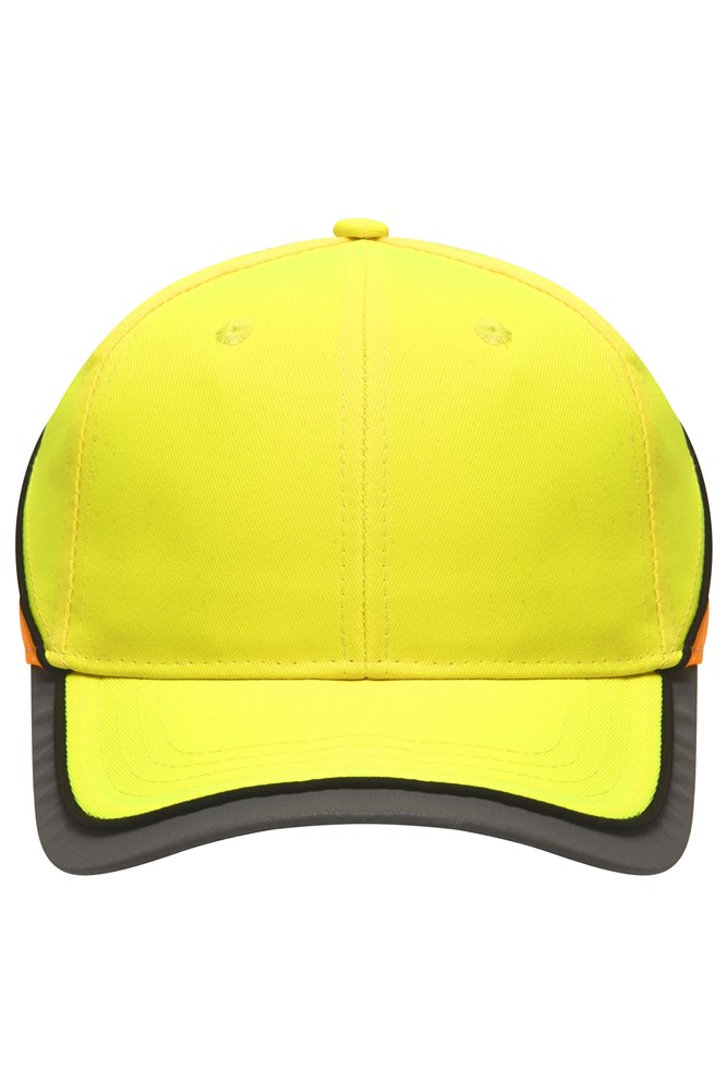 2 embroidered ventilation holes 4 stitching lines on the peak Contrasting piping around the cap Laminated front panels Padded satin sweat band Reflective hook and loop fastener and border around the peak (without protective function/no PPE) Hook and loop fastener 6 Panel laminated front panel