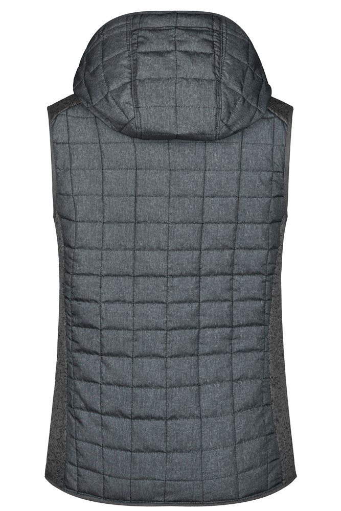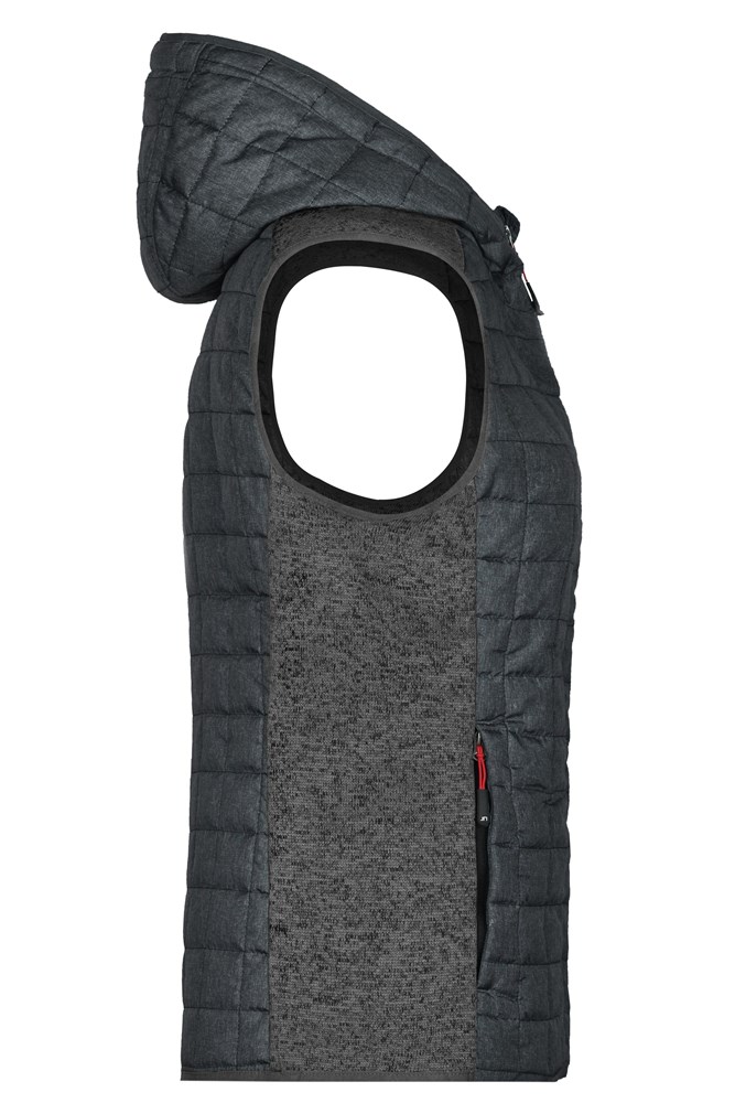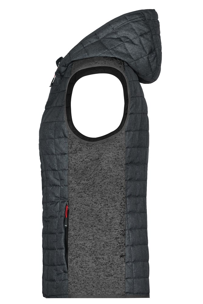 Soft, warm and easy care fabric in melange look Front, back and hood in quilted diamond pattern Hood adjustable on the inside Full-length under-panel zip 2 zipped side pockets 2 inner pockets JN767: waisted form 1/2 chest: 47 cm length from shoulder: 63 cm OEKO-TEX® Standard 100 (15.0.70467) quilted knitted fleece Hood