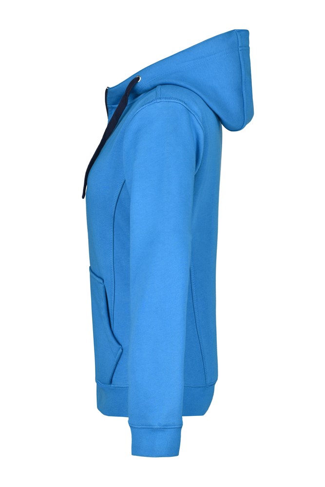 Full-zip, cord and inside in contrasting colour Hood with chin cup Cuffs and waistband with elastane Kangaroo pocket, flatlock seams JN354: Waisted form 1/2 chest: 52 cm 1/2 waist width: 46 cm 1/2 bottom width: 50 cm length from shoulder: 64 cm sleeve length: 61 cm OEKO-TEX® Standard 100 (15.0.70467) Cotton/Synthetic doubleface bonded Hood YKK-Zipper