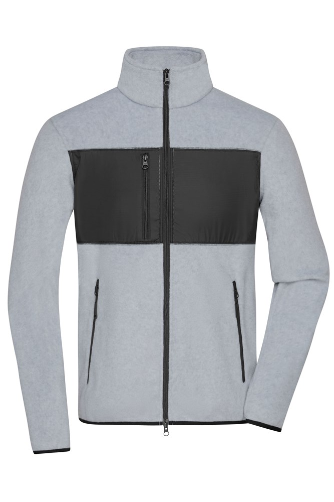 Classic, soft and easy care fleece of recycled polyester Insert of woven fabric with breast pocket at the front 2 side pockets and 1 zipped breast pocket 2 inner pockets Two-way front zip, stand-up collar JN1311: lightly waisted YKK-zips 1/2 chest: 54 cm 1/2 bottom width: 51 cm length from shoulder: 70 cm sleeve length: 64 cm GRS Standard YKK-Zipper