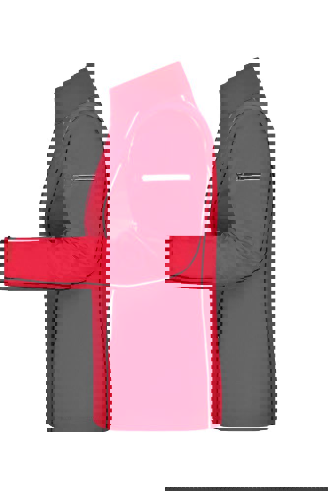 3-layer functional material with TPU membrane Wind and water repellent (5,000 mm water column) Breathable and permeable to water vapour (1.000 g/m²/24h) Non-taped seams Stand-up collar Inside in contrasting colour, contrasting piping at the front, at the back and on the sleeves Fashionable reflective, under-panel front zip Fashionable reflective details on shoulders, at the back and on the sleeves 2 side pockets, 1 zipped inner pocket Pocket on sleeve with reflective zip JN1121: waisted 1/2 chest: 49 cm 1/2 waist width: 43 cm 1/2 bottom width: 49 cm front length from shoulder: 64 cm length back from shoulder: 66 cm sleeve length: 62 cm Softshell Breathable-Permeable to water vapour Water column from 1.500 mm Water column from 2.000 mm Water column from 3.000 mm Water column from 5.000 mm wind- and water-repellent