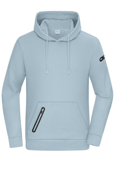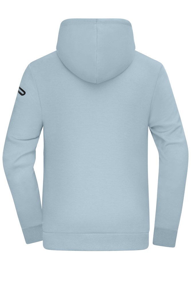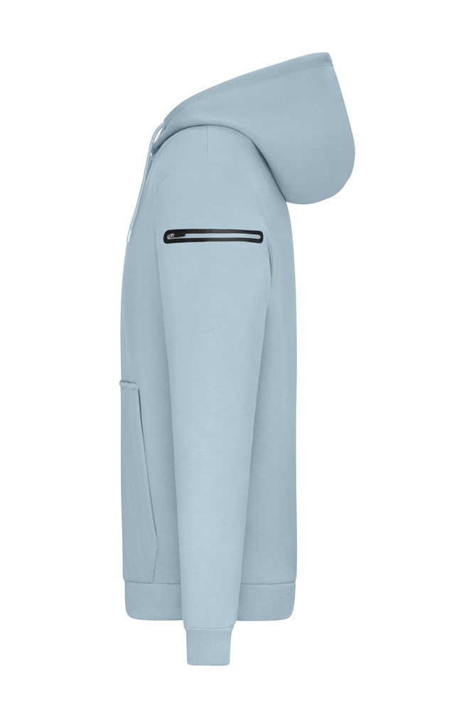 High-quality interlock fabric Pleasant mix of organic cotton, recycled polyester and elastane Technical details Kangaroo pocket with an additional zipped pocket Zipped pocket on left sleeve Zipped pockets bordered with fashionable tape 8045: lightly waisted 1/2 chest: 52 cm length from shoulder: 70 cm sleeve length: 65 cm OEKO-TEX® Standard 100 (25.HDE.51239) Organic Cotton OCS Standard blended RCS blended Hood