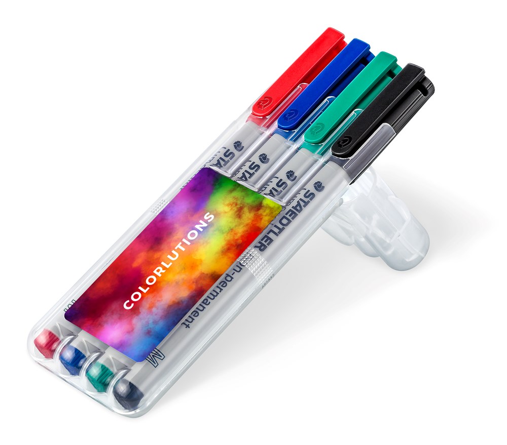 universal pen for almost all surfaces, suitable for overhead projection, water-soluble ink, line width M (approx. 1.0 mm), barrel grey, cap and end in ink colour, pens with STAEDTLER imprint, housing made of 97% recycled plastic, 4 colours in stand-up STAEDTLER box, Made in Germany