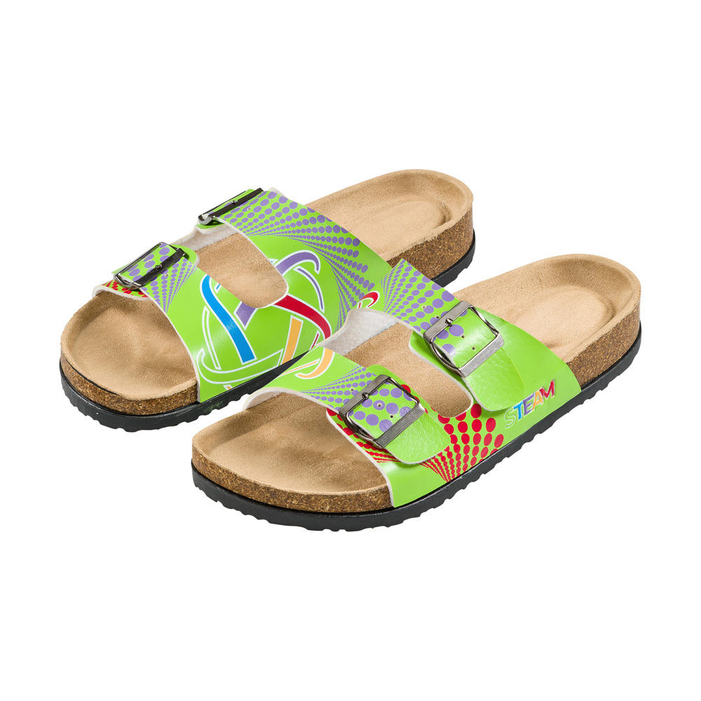 Our customizable "Rockford" sandal combines modern design with exceptional wearing comfort. It is a durable and comfortable companion for everyday use, perfectly suited for companies, clubs, and individuals. Whether as a premium employee gift, merchandising item, or promotional product – this sandal can be fully customized and fits any occasion. Available in sizes 36 to 46, with a minimum order quantity of only 10 pairs and no minimum per size. The ergonomic cork footbed ensures secure support, while the breathable PU strap offers maximum comfort. The non-slip sole profile provides excellent grip, and the durable metal buckle adds extra stability. Logos can be applied via embossing in 1C to 4C, with optional personalization of up to 10 characters. Each pair is packed in a practical polybag. Production and delivery time is approximately 20 working days. Quality samples available on request.