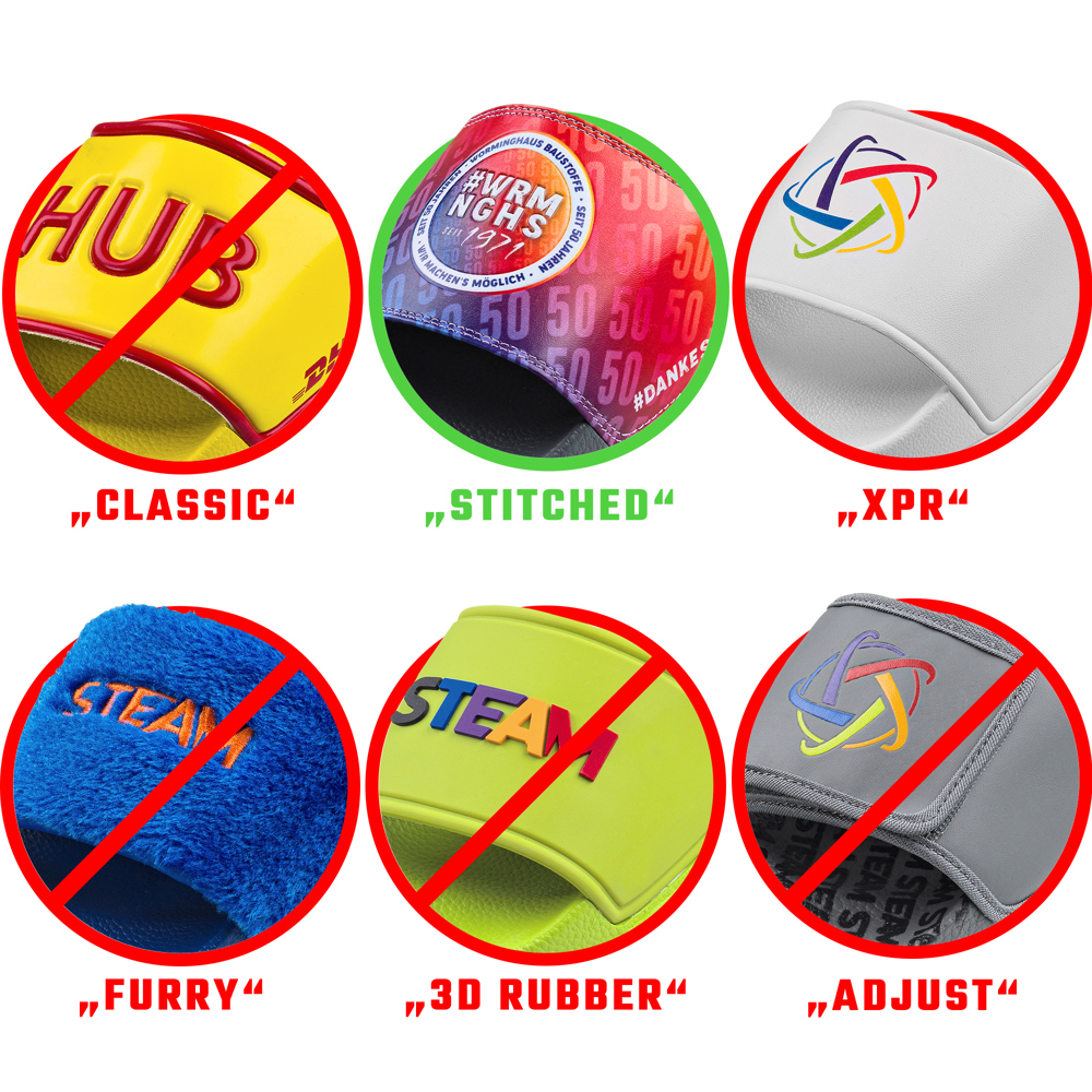 Experience maximum comfort with our stitched flip-flops in the printed and embossed version. The soft sole made of durable PVC and the comfortable shoe bridge made of soft PU with neoprene textile on the inside offer a pleasant wearing comfort. With this model, the shoe bridge can be individually printed and embossed with your logo in 1C to 4C full color. Compared to the Classic version, the embossing is less deep. The design offers the advantage that logos with a color gradient can also be reproduced.