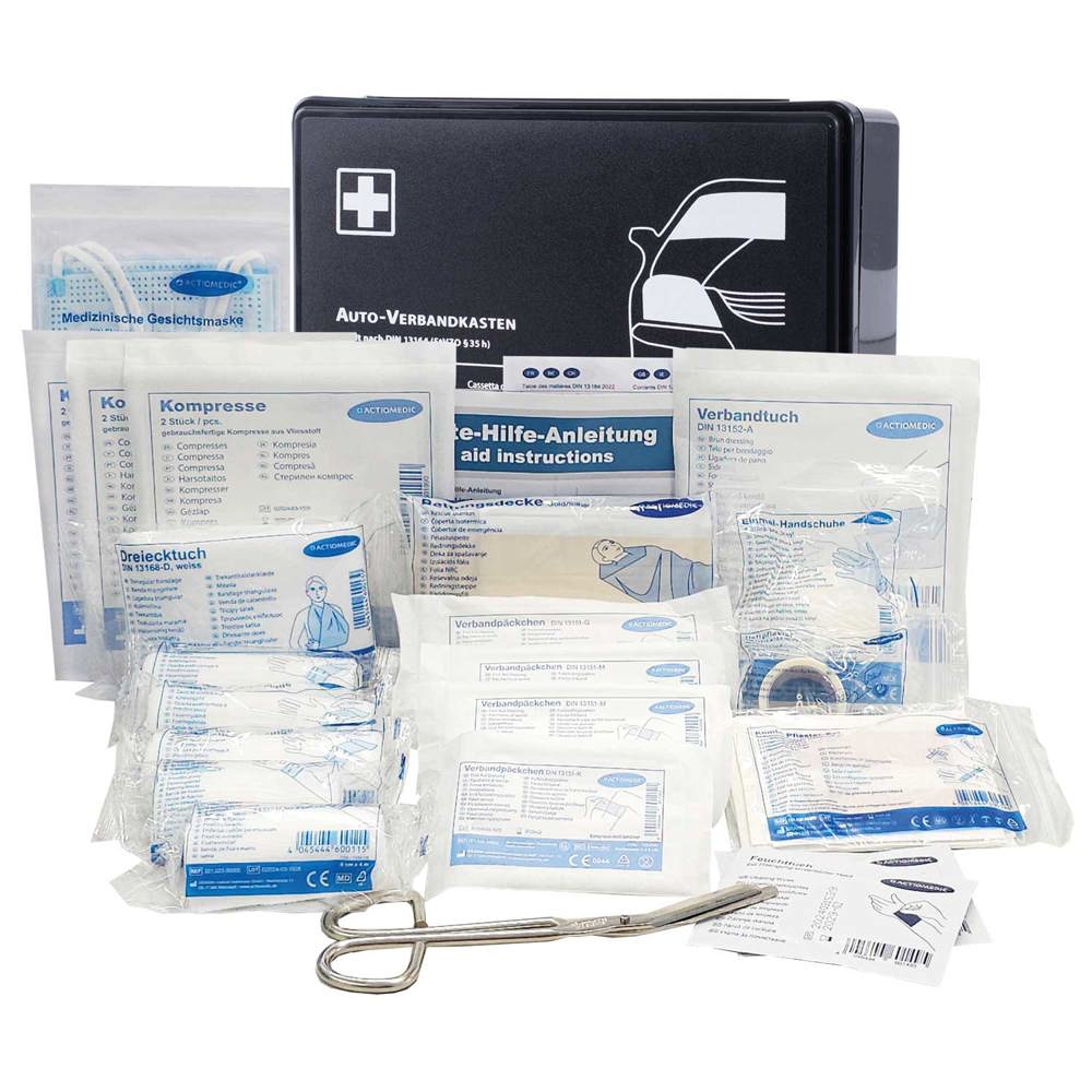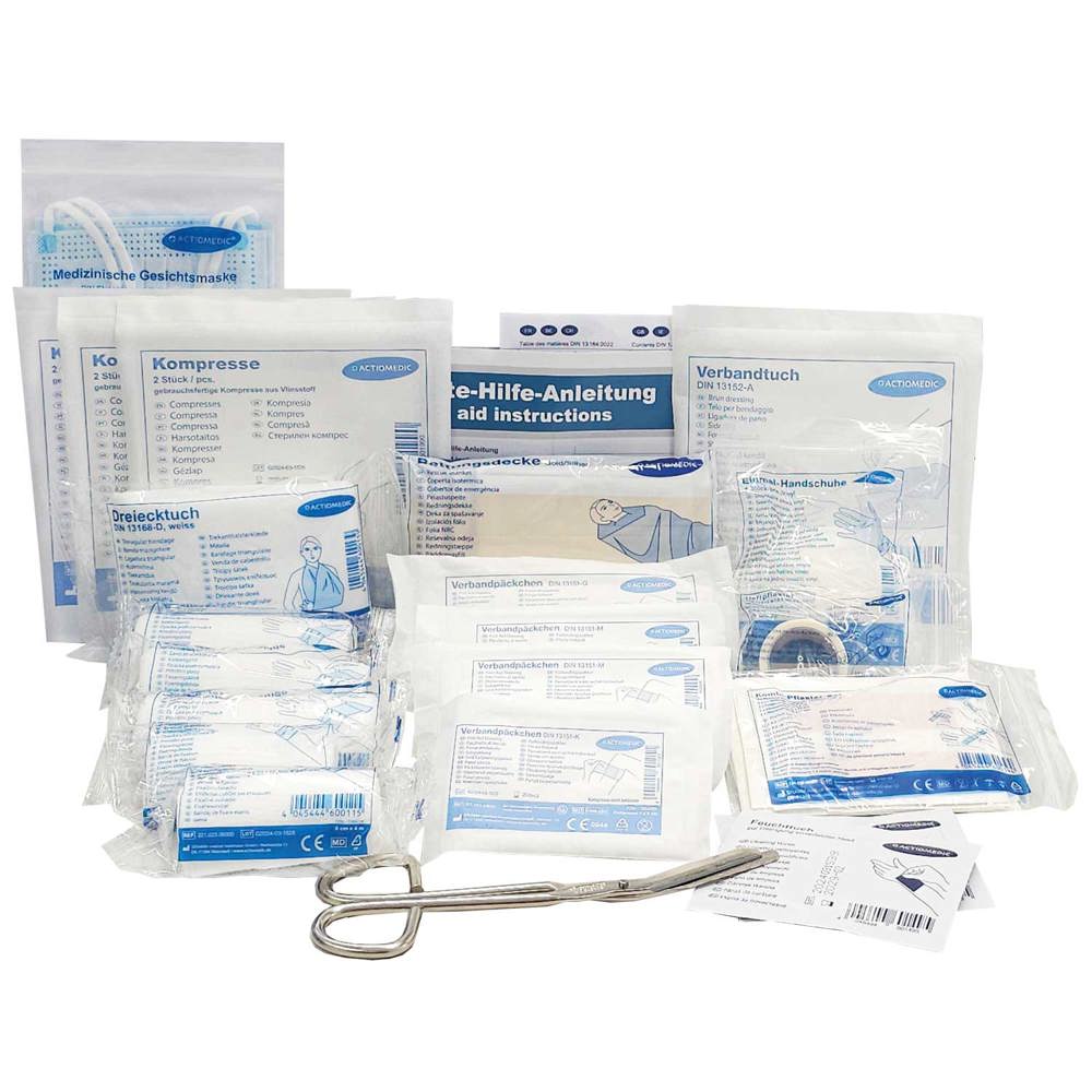 CONTENTS GRAMM quality bandage material in accordance with DIN 13 164:2022 1 adhesive plaster 1 ACTIOMEDIC® plaster set, 14 pieces 3 dressing packs 1 dressing cloth 6 wound compresses 1 rescue blanket 5 fixation bandages 1 triangular cloth 2 moist cleaning cloths 1 pair of scissors 2 pairs of disposable gloves 1 face mask 1 First aid instructions 1 table of contents