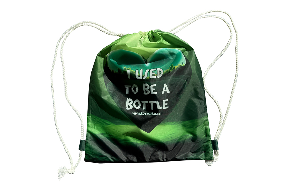 This BottleBag pack is foldable. It has drawstrings on each side, which makes it easy to carry on the back or around the shoulder. The stings are made out of cotton. The backpacks are made out of five PET bottles per bag and are easily foldable. The BottleBag Pack is made out of 190T polyester rPET. The size is 47 x 29 cm. The weight is 46 grams. The simplest option to print a BottleBag Pack is the white bag with a one colour silkprint on it. The print could be anything; from a single colour logo to our original “I used to be a bottle” design. It is also possible to print the bag in one colour, PMS, all over print or full colour sublimation.