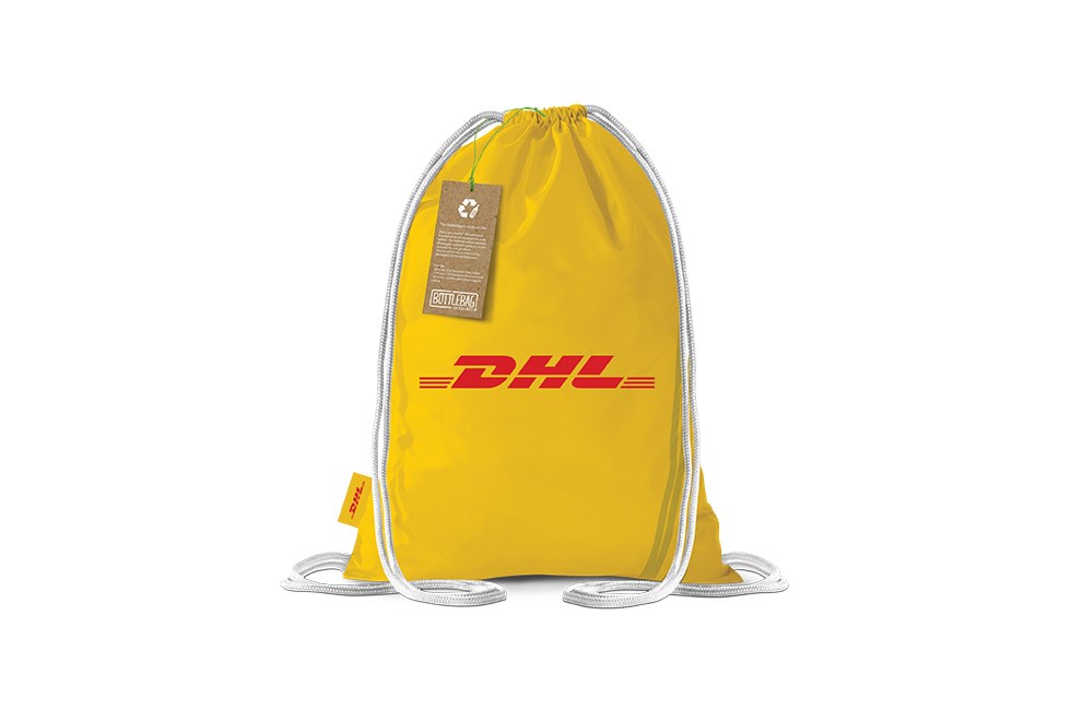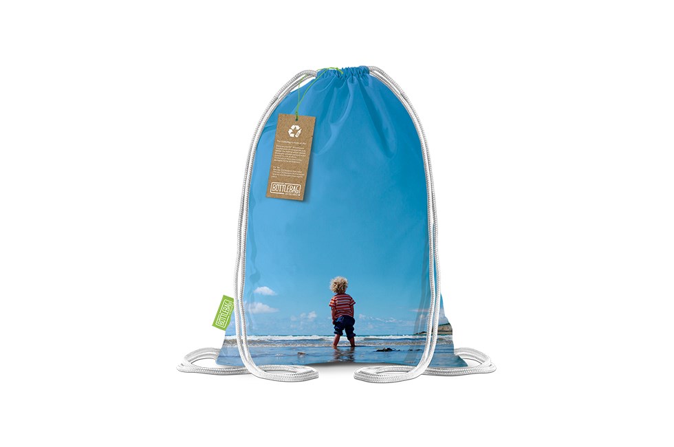The BottleBag pack has drawstrings on each side, which makes it easy to carry on the back or around the shoulder. The stings are made out of cotton. The backpacks are made out of five PET bottles per bag and are easily foldable. The BottleBag Pack is made out of 190T polyester rPET. The size is 47 x 29 cm. The weight is 46 grams. The simplest option to print a BottleBag Pack is the white bag with a one colour silkprint on it. The print could be anything; from a single colour logo to our original “I used to be a bottle” design. It is also possible to print the bag in one colour, PMS, all over print or full colour sublimation.