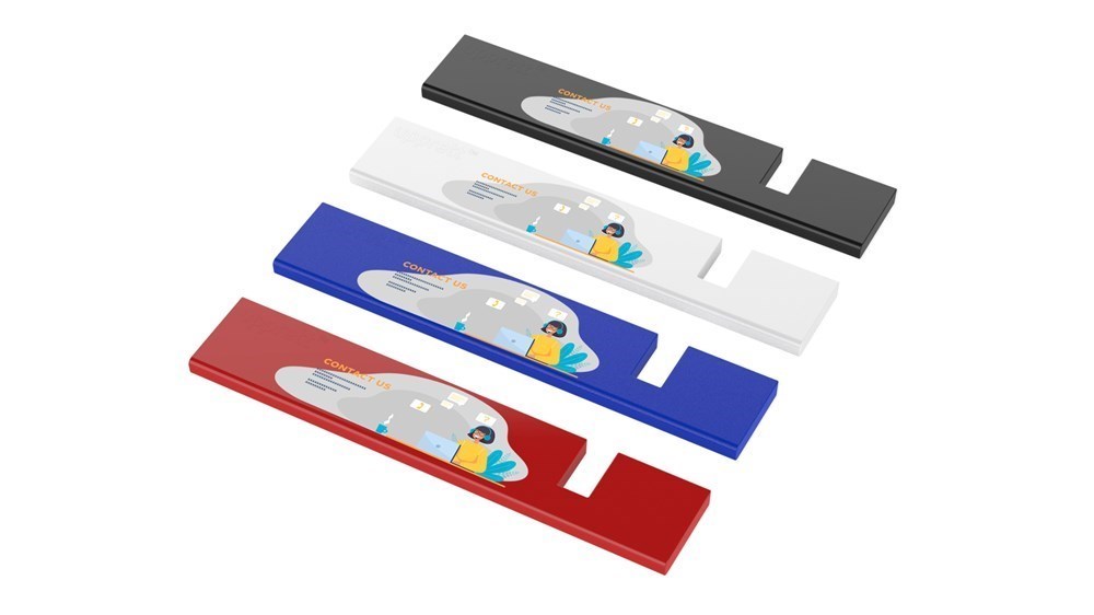 Same functions, different material. The Upprett portable smart stand keeps your device in the desired viewing angle. By using PET plastics we are able to increase the customization possibilities to full color, full body print. Designed by Beata Franso, Amsterdam based artist/designer. Produced in Germany.