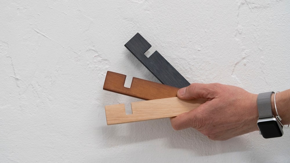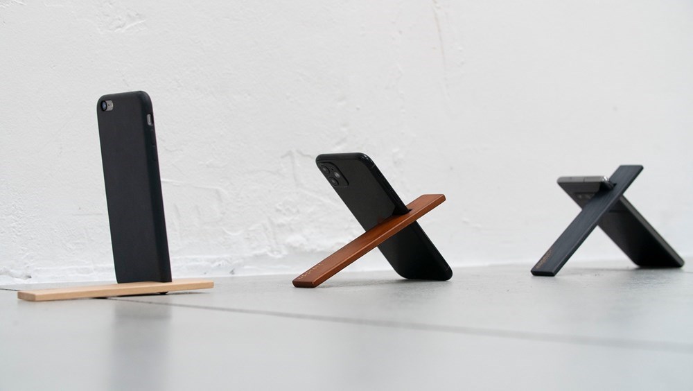 Portable phone stand providing multiple viewing angles by placing the stand on either the long or short side; holds device in either portrait or landscape position. Easily slides around most smooth surfaces for quick repositioning. Durable and 100 % made of fast growing Alnus wood. Easy to open and fully recyclable paper based packaging.  Extremely lightweight and compact design with no moving parts, ready for travel. Designed by Beata Franso, Amsterdam based artist/designer.