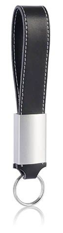 USB flash drive with key ring, genuine leather strap and metal plate.