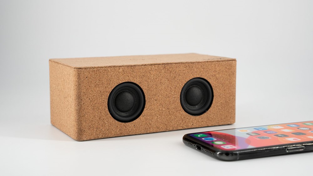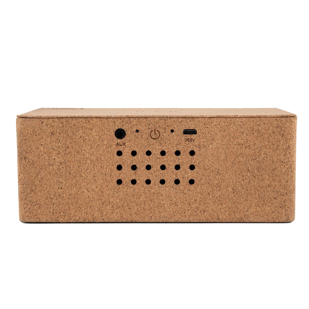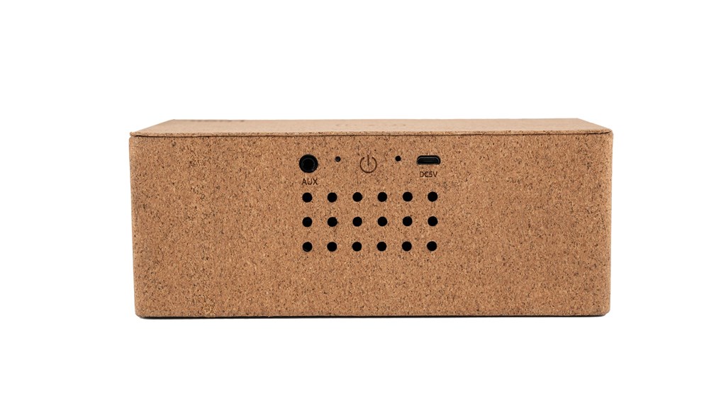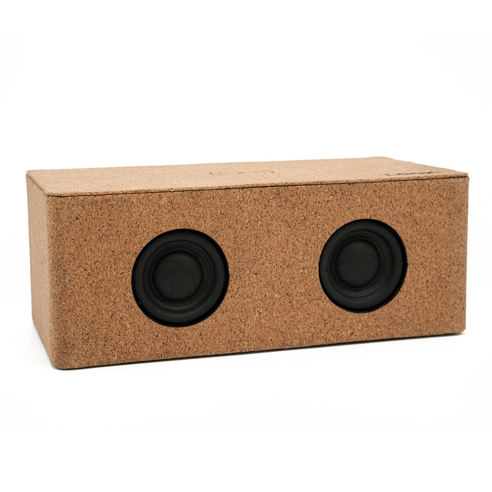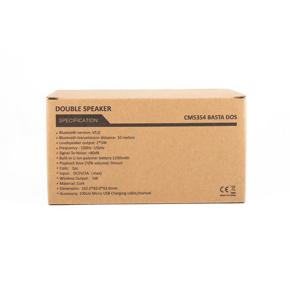 How cool. BASTA DOS is a 2 x 3W wireless speaker and 5W wireless charger (Qi) made of eco friendly cork material. The build-in lithium battery ensures playing time of about 5 hrs. Simply put your phone on top of the speaker and charging will start automatically. Including charging cable.