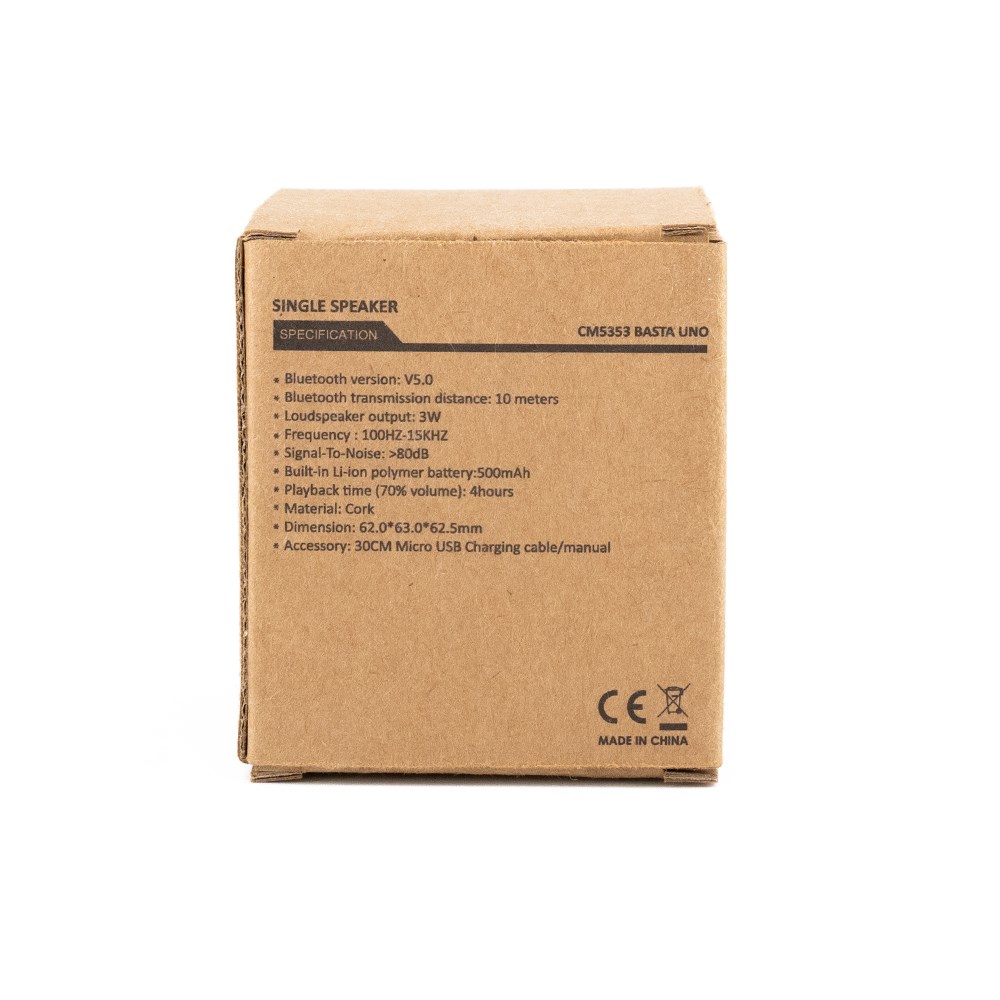 How cool. BASTA UNO is a 3W wireless speaker made of eco friendly cork material. The build-in lithium battery ensures playing time of about 5 hrs. Compact size with premium quality sound. Including charging cable.