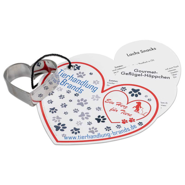 Natural meat, some fruit and vegetables as well as healthy carbohydrates and fats - this is what a dog's digestive system has been designed for. Cats, too, eat products without additives in their natural environment. Meanwhile, lovers of fur noses attach just as much importance to a healthy diet for their furry family members as they do for humans.To ensure that velvet paws and co. receive individually tailored food, pet owners can now lend a hand themselves and quickly pamper their pet with the help of the nutritious treat recipes and the stainless steel mould in the shape of a heart. The cover page of the heart-shaped recipe pad can be customised and is therefore super suitable for the advertising message of pet-related advertisers. Suitable are all recipes for dogs and cats. Please note that the recipes are only available in German.