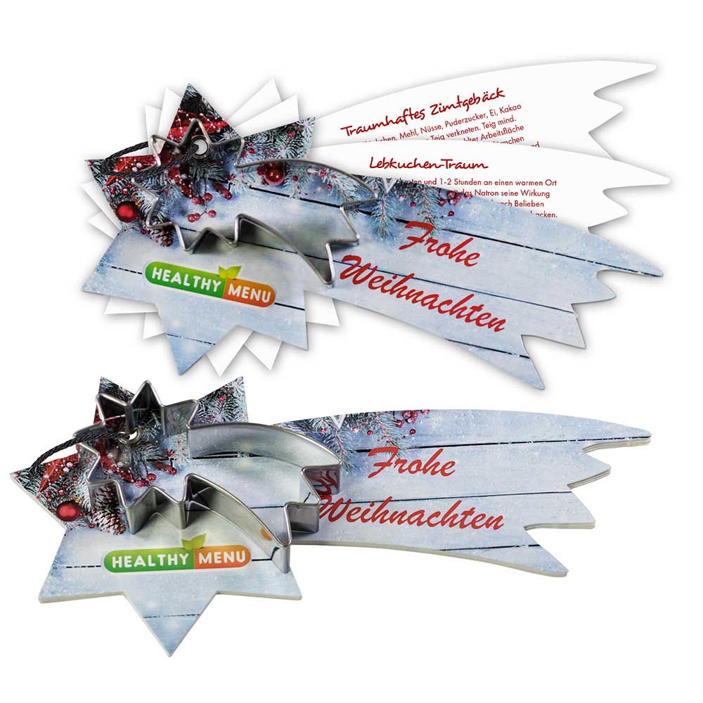 Optionally, the baking-shape and recipe pad are packaged in an A6 folder. This comes with a choice of a Christmas design (a 1-c or 2-c logo imprint is possible) or can be customized in 4-c.