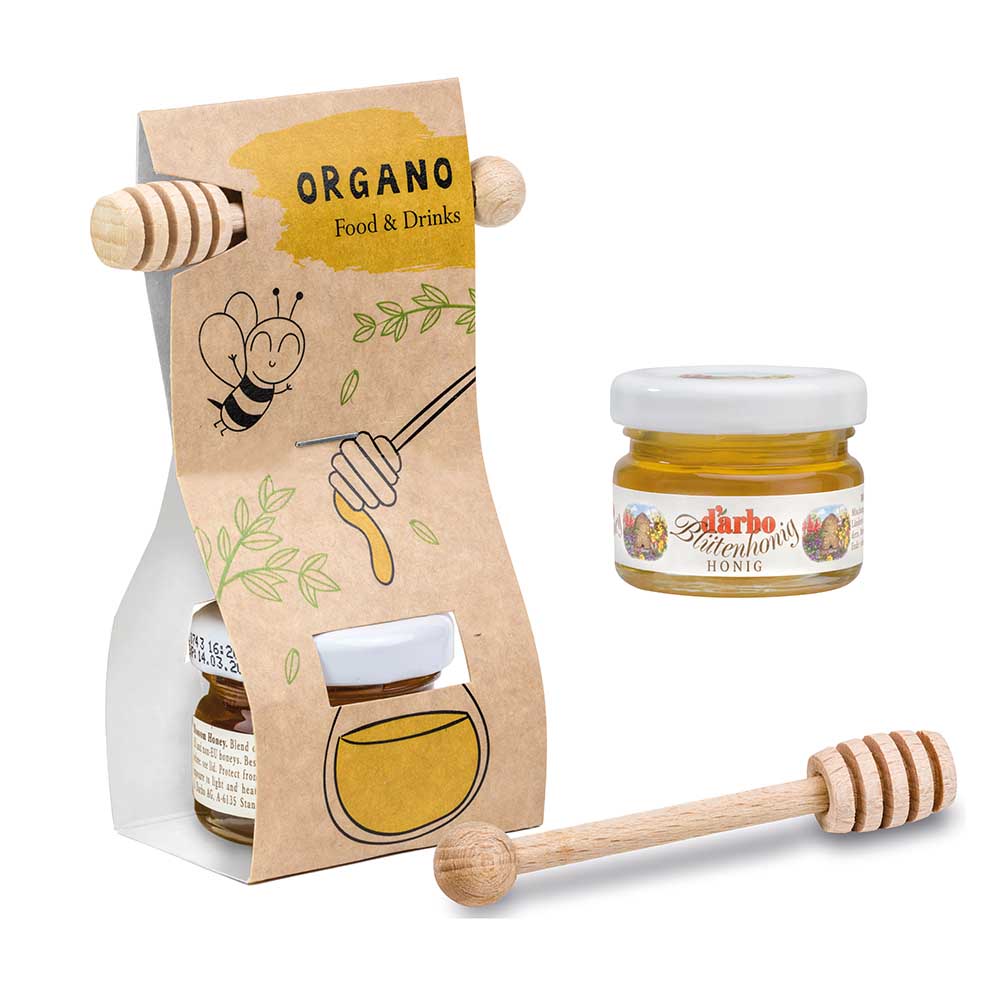 The cute honey set allows customers to enjoy delicious, natural honey. The small honey jar in the set with the wooden honey spoon, in a customisable gift box, becomes a representative promotional Christmas present. Sweet indulgence that melts in your mouth - that's our honey set. It contains 28g of honey.