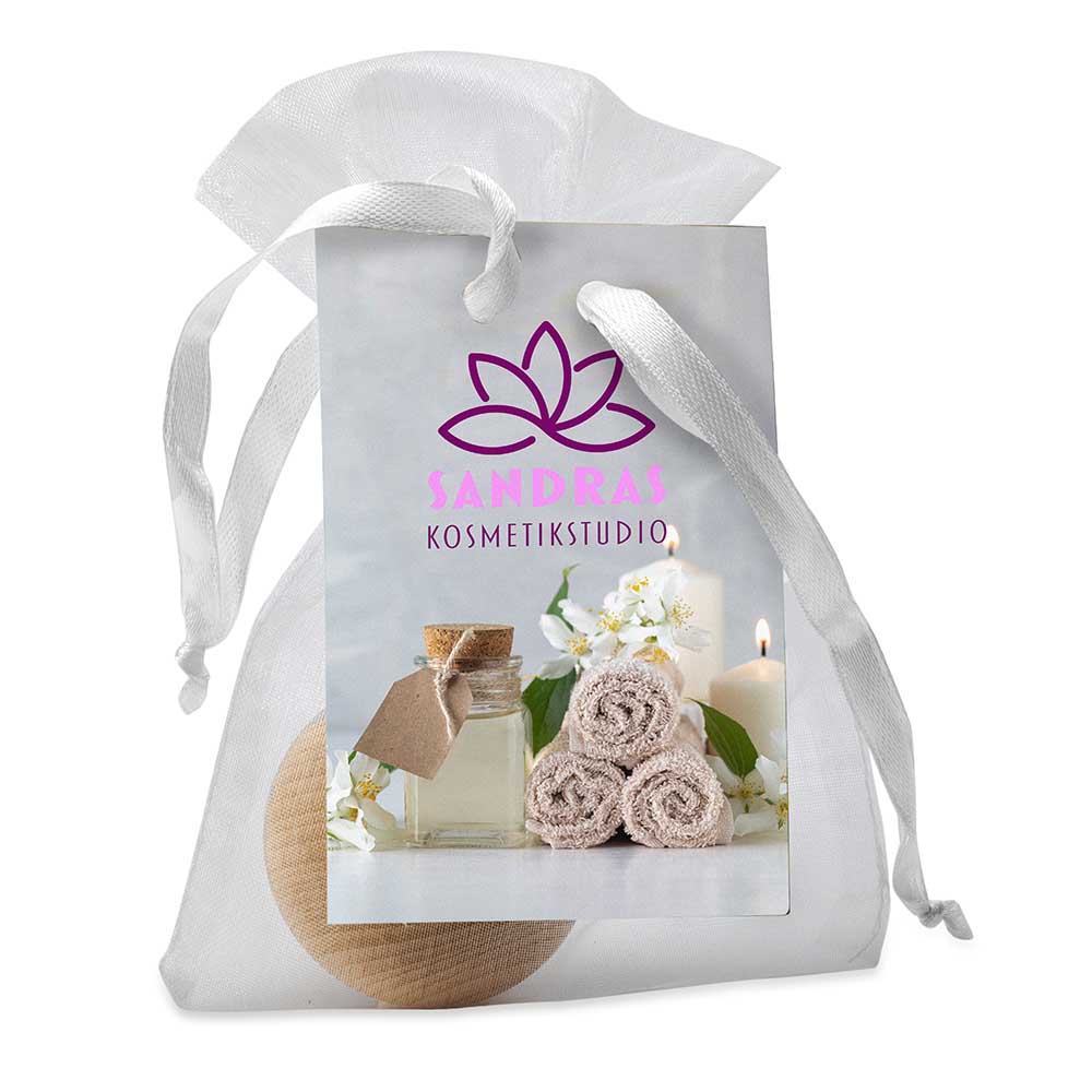 The hand flatterer made of untreated wood promises peace, relaxation and a pleasant feeling. With its smooth surface, soft edges and interesting shape, it offers a pleasant and at the same time (relaxing) tactile experience. Optional laser engraving ensures lasting advertising. Delivered in an organza bag with an attached hangtag, which can be individually designed on the front and back.