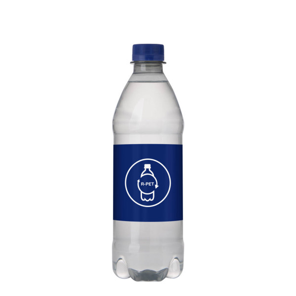 500 ml natural spring water in an R-PET bottle with screw cap. Kappe Farbe weiss.
