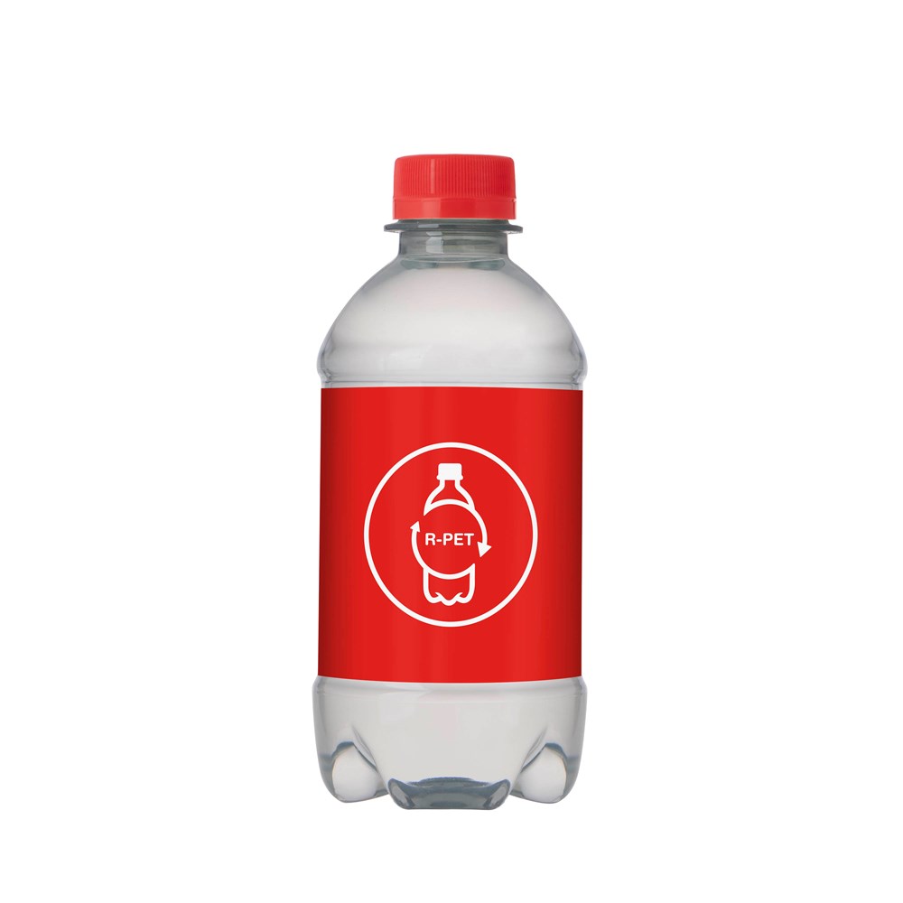 330 ml natural spring water in an R-PET bottle with screw cap. Cap colour transparent