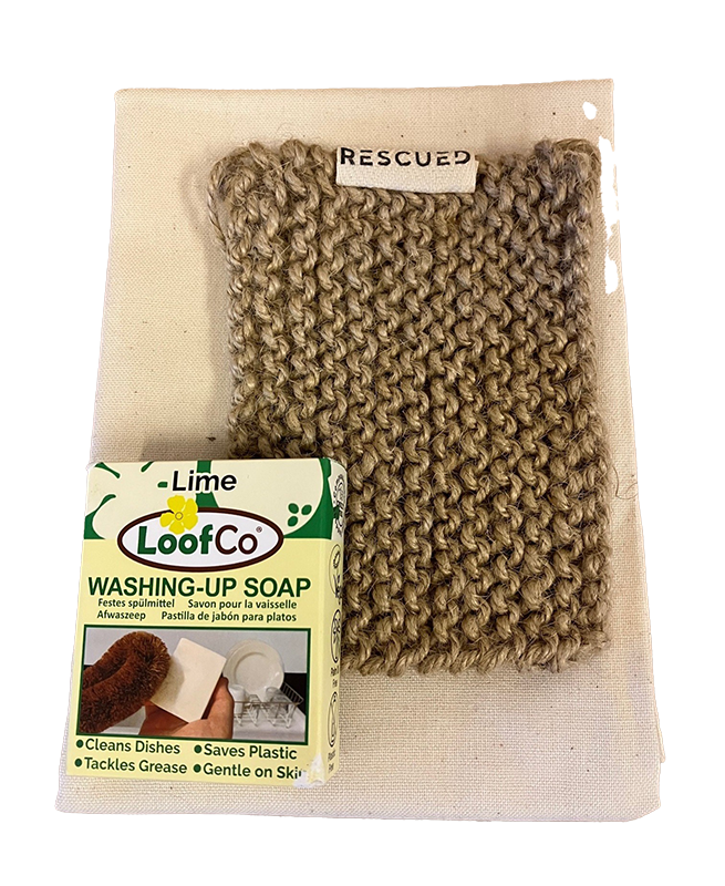 The set includes tea towel, washing-up soap and bulap scouring cloth.