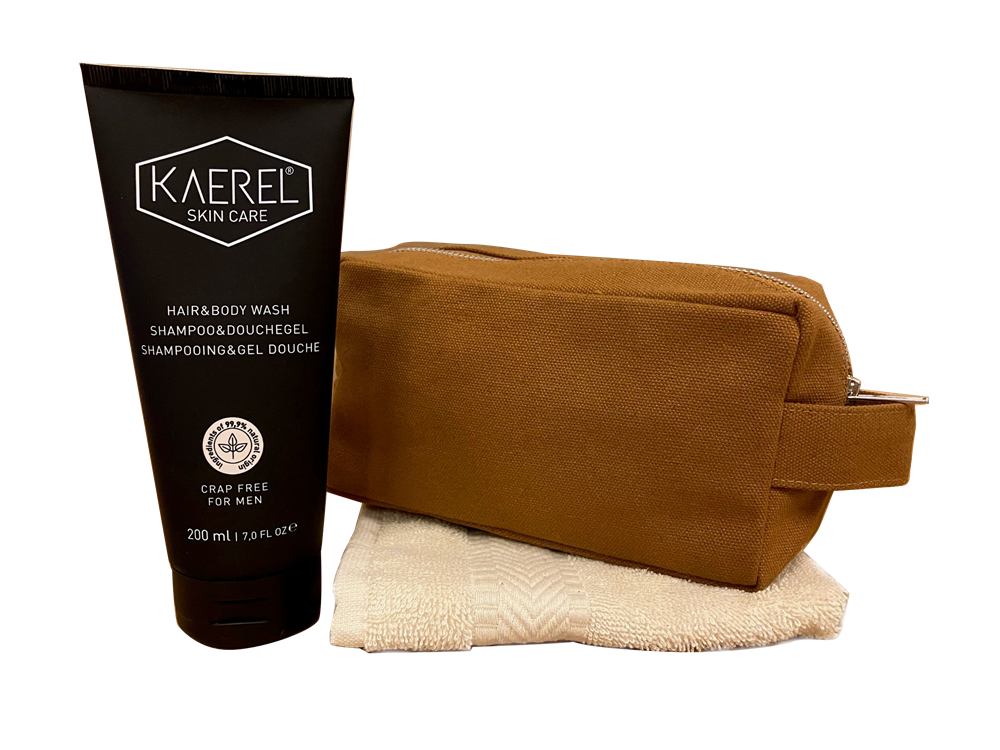 Start the day fresh with this stylish pack. The hair & body wash fit together with the facial tissue in the handy toiletry bag.