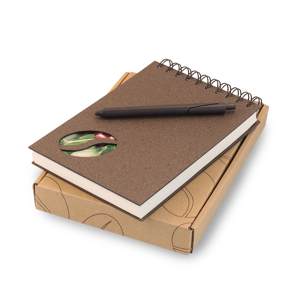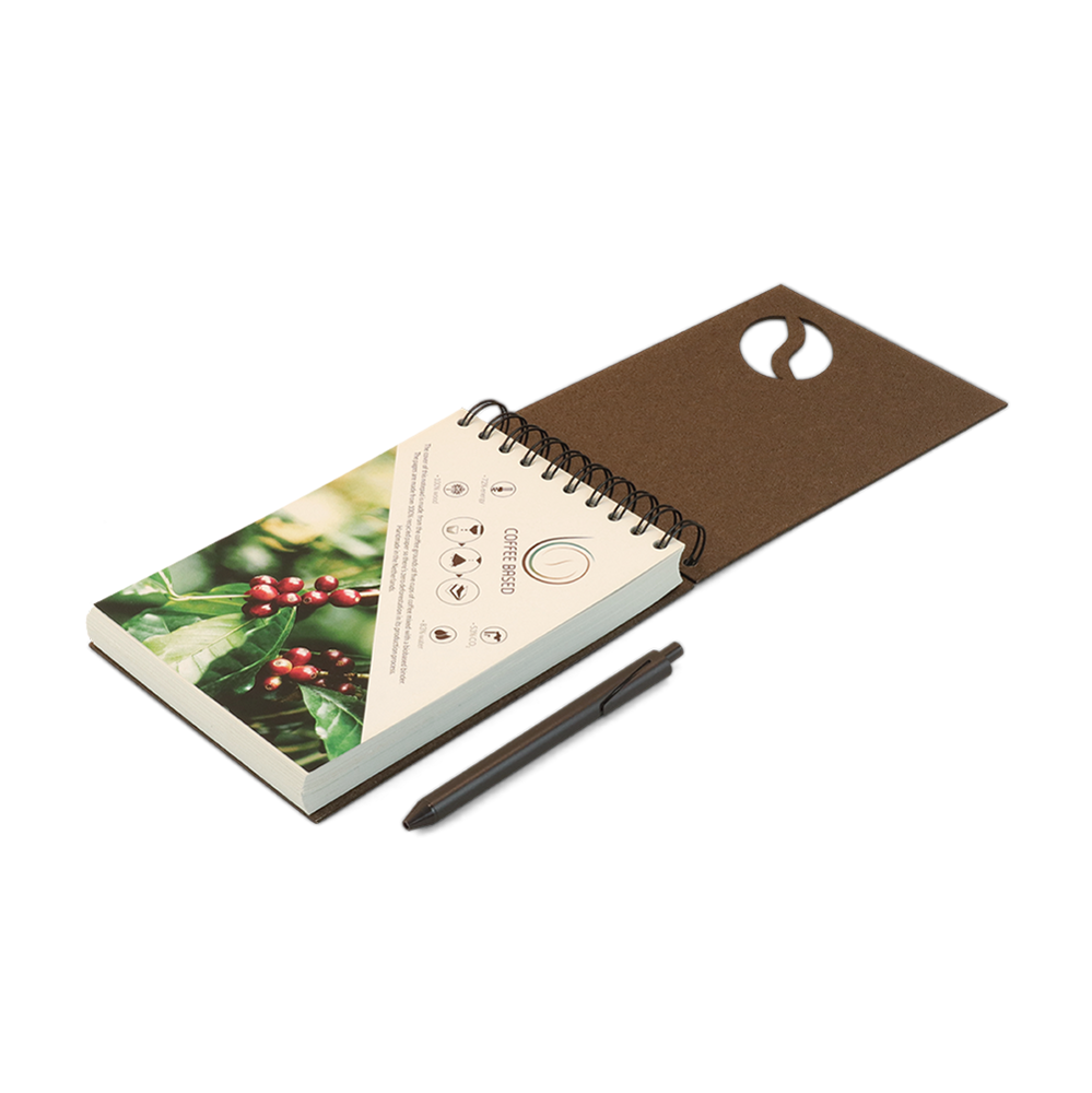 Discover the perfect combination of durability and style. This set includes a beautiful notepad with a sturdy ring binder and covers made with reused coffee grounds, which still smell subtly of coffee. Thanks to its clever design, you can use the notebook both vertically and horizontally. The inside is filled with blank paper, ideal for all your to-do lists, notes and creative sketches. An original and eco-friendly gift for any coffee lover!