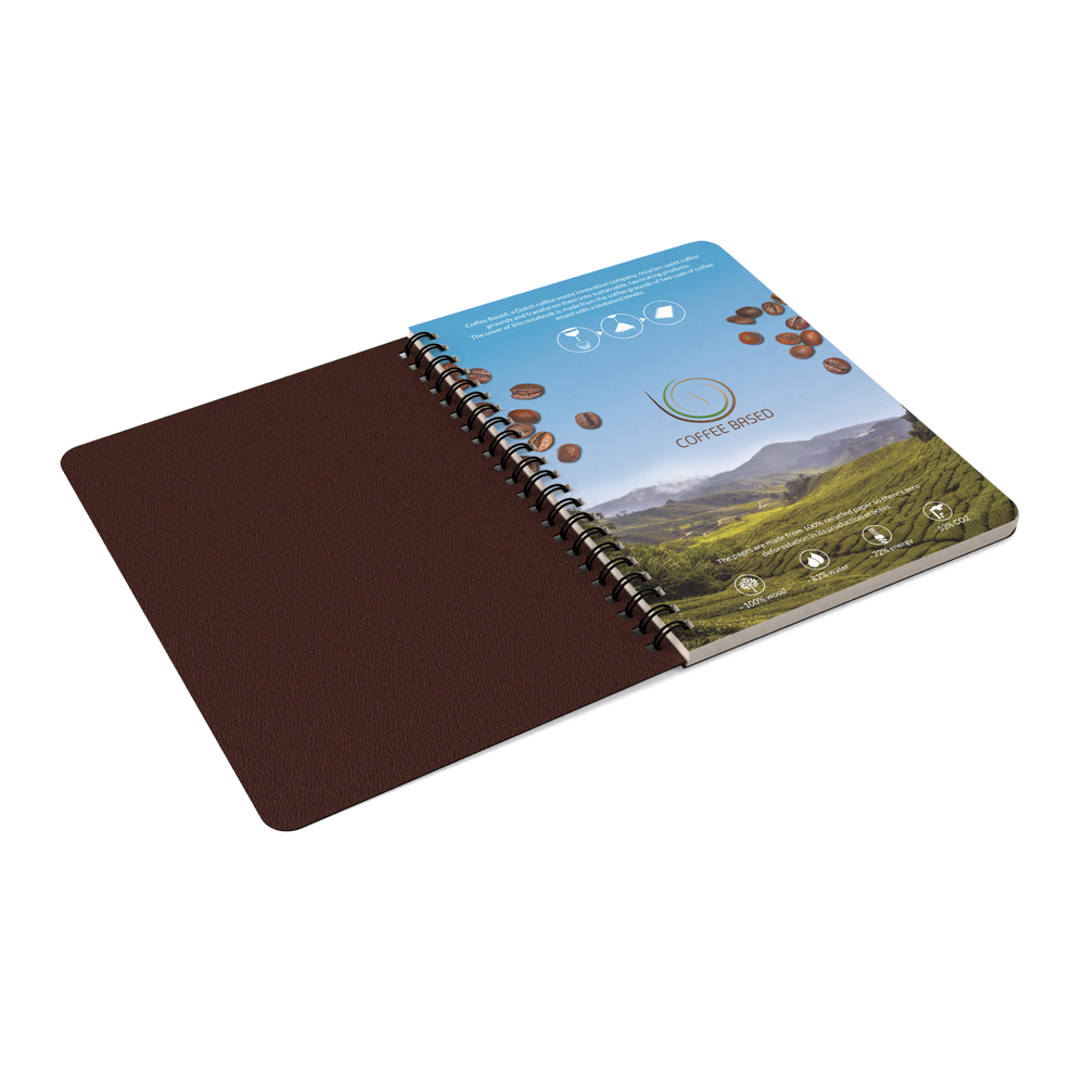 This A5 spiral notebook has a flexible cover made with the coffee waste from 1-2 cup(s) of coffee and lends itself perfectly to taking notes during important conversations, brilliant hunches and engaging presentations. The paper in the notebook is 100% recycled. The notebook consists of 140 pages (70 sheets) of 100% recycled lined paper 80 g/m².
