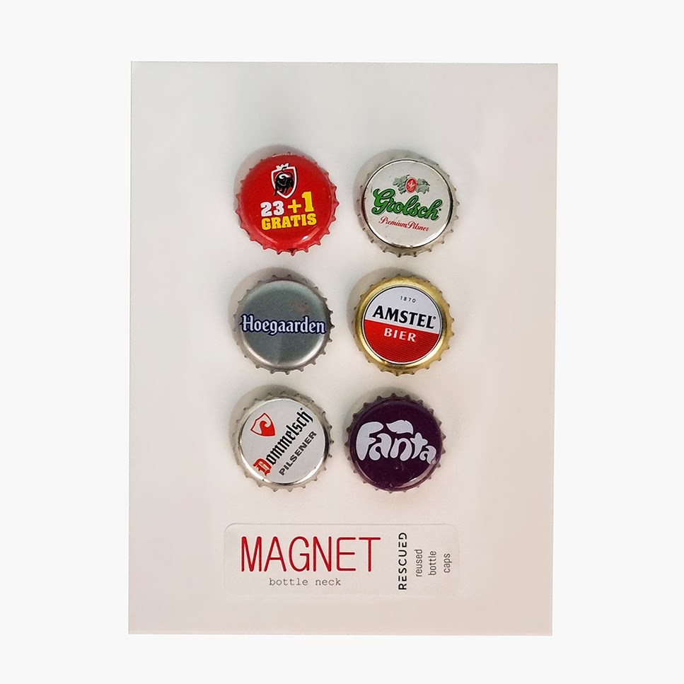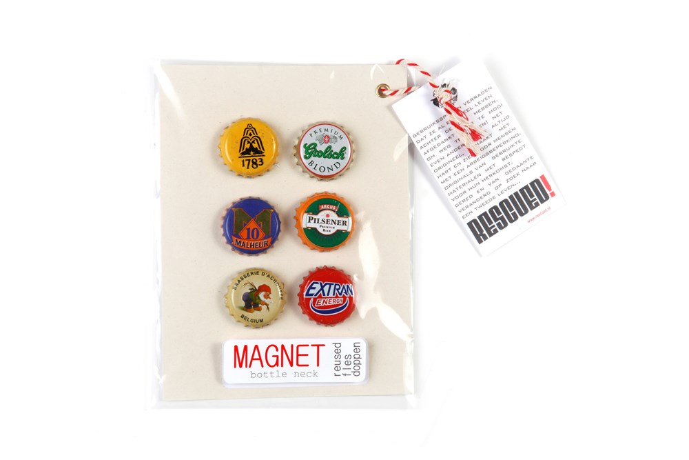 With The Magnet stay put! These strong magnets on card are made from crown caps and come straight from the bottle. Fun and always handy. For example, on Rescued's memory board.