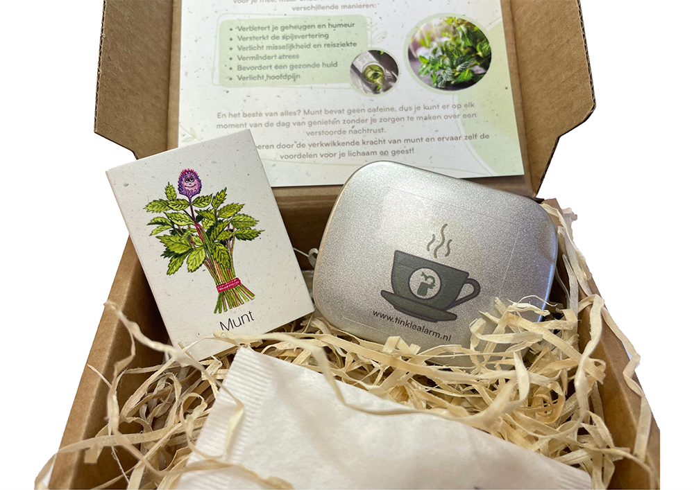 This growing box has everything you need for a delicious cup of tea: a can of fresh mint tea, a tea bag and a mint growing box. So you can enjoy your tea right away while you grow the new tea!