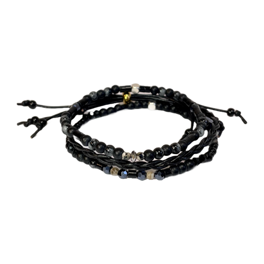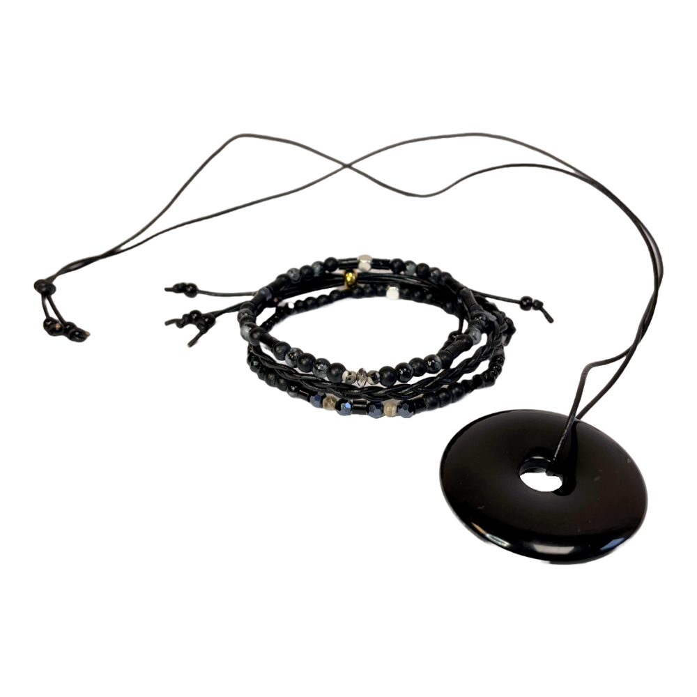 Set consisting of three bracelets with various beads and a necklace.