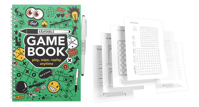 MOYU has something new! A magical, reusable game book made of stone paper. That's right, no trees were cut down to bring you countless hours of penmanship.
