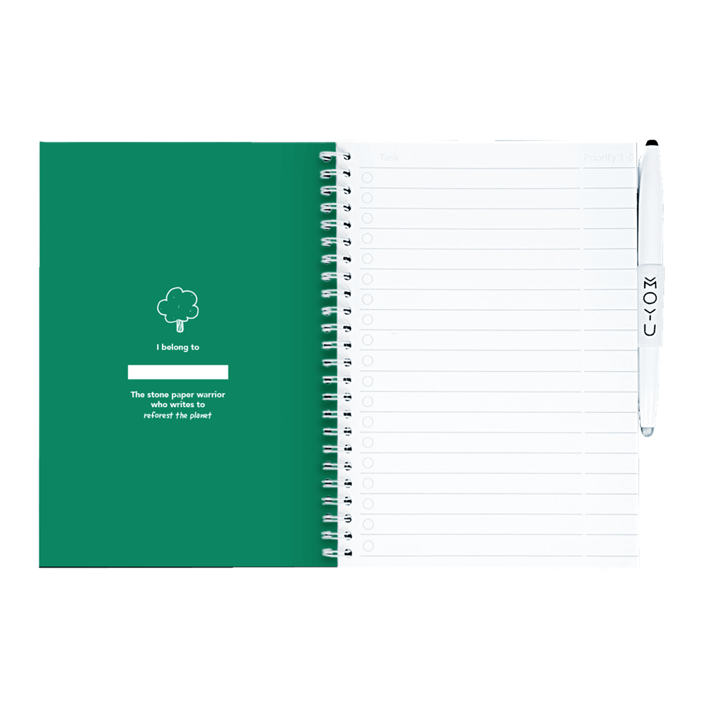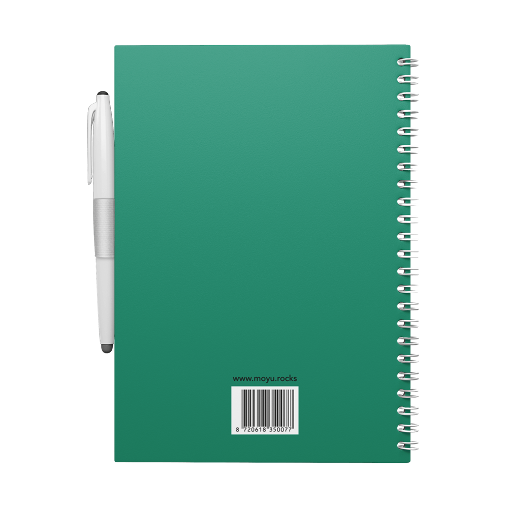 A MOYU notebook is made of stone paper. But this stone paper is even more special than you might have seen or tried before. This is because this stone paper is very sturdy. The notebook comes with a Pilot Frixon pen and a cloth. You write in the notebook with this pen. And with a damp cloth you wipe away the text you have written in 1x. Wiping it off is not easy when you go over it with your hand, so the text stays put. But as soon as you go over it with a wet cloth, your page is completely empty again. And hence the sturdy paper. This allows you to use and clean a page up to 500 times!